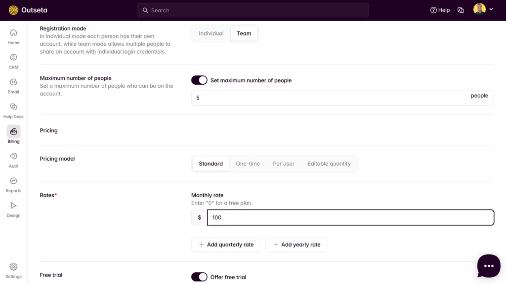Outseta support per user pricing models, giving you the flexibility to charge a set fee to each user who needs access to your site or content.